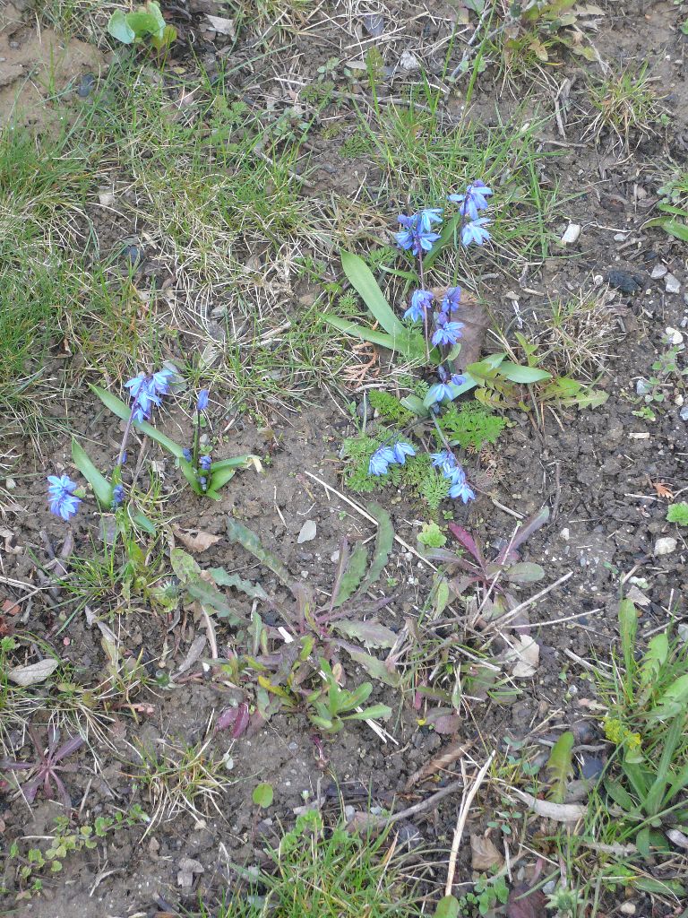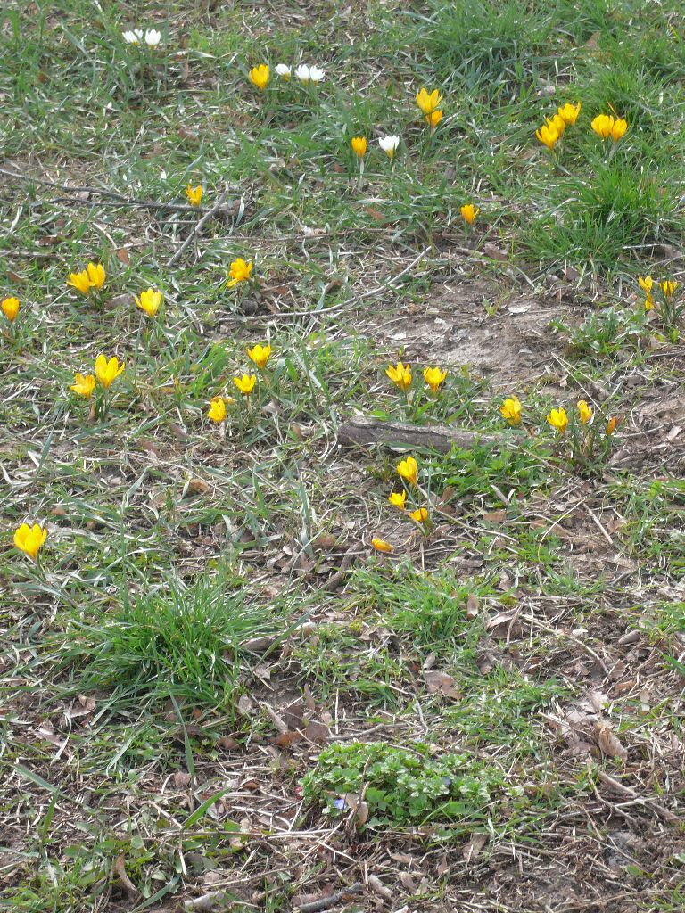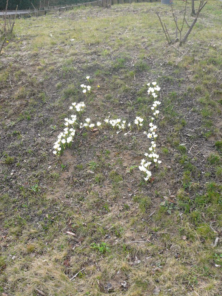 unserer Pflanzaktion. Die Krokusse vor dem Kindergarten Mammutzahn wachsen - wie in dem Plan der Stadt Leonberg vorgegeben - in ungeordneten Gruppen. Dagegen haben