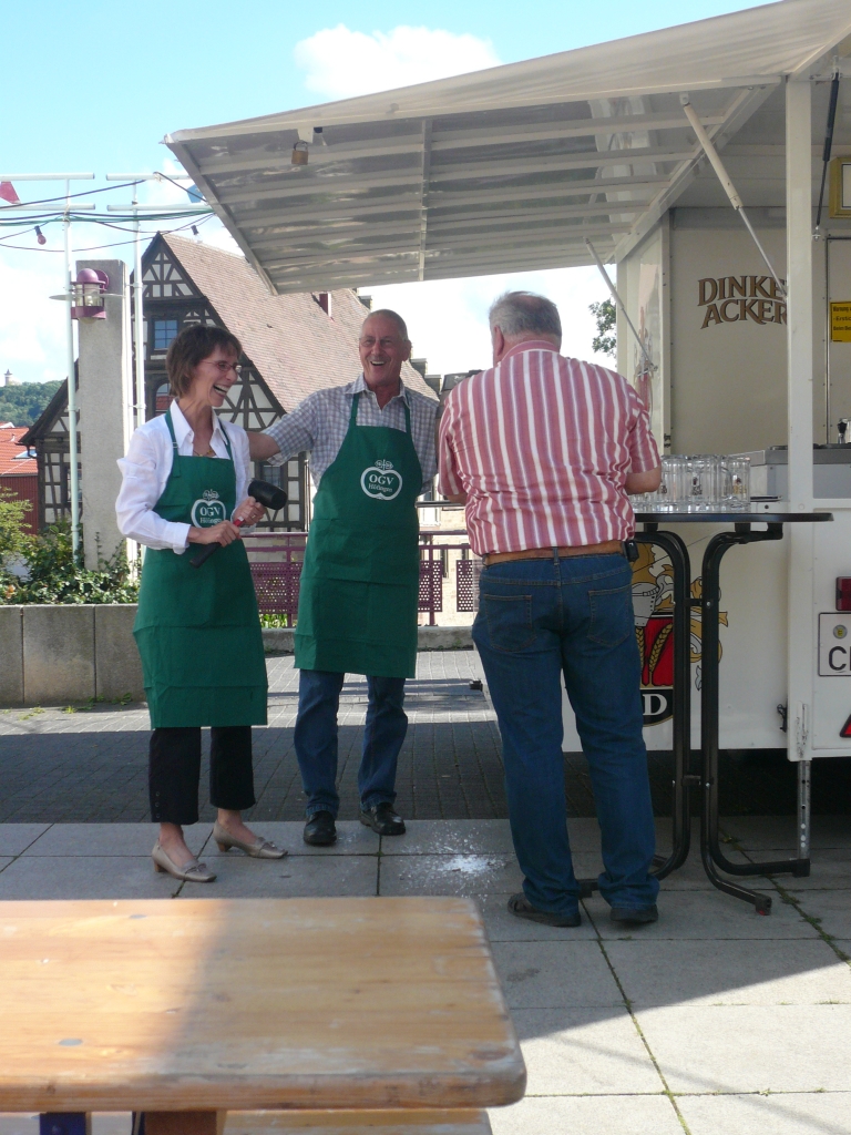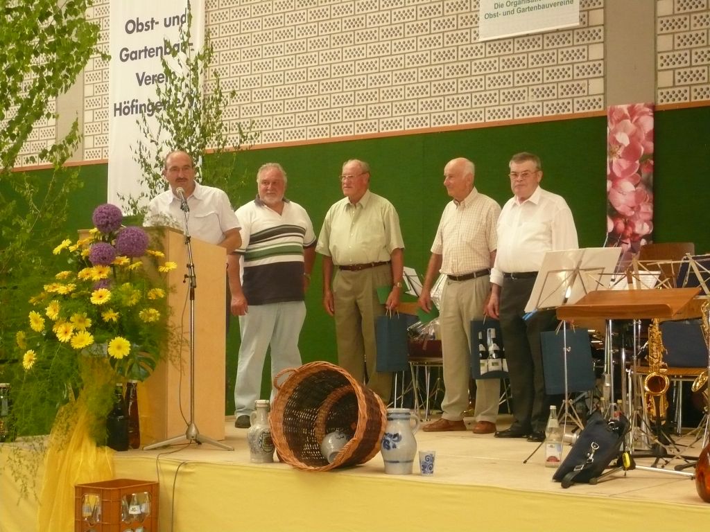Die Wanderung mit ca. 250 Teilnehmer haben großen Anklang gefunden, und man hat viel wissenswertes über Höfingen erfahren. Zwei Traktoren mit Anhänger sowie ein PKW versorgten unterwegs die Wanderer mit Getränken, die wegen der großen Hitze dankend angenommen wurden. Nach Rückkehr von den einzelnen Routen, konnten sich die Teilnehmer bei einem Mittagessen stärken. Es folgte die Begrüßung der Gäste durch den 1. Vorsitzenden des Kreisverbandes Herrn Helmut Plaz und durch Oberbürgermeister Herrn Bernhard Schuler. Herr Helmut Plaz überreichte im Auftrag von Herrn Erhard Hahn, Präsident vom Landesverband für Obstbau, Garten und Landschaft, Baden-Württemberg e.V. die Ehrenmedaille sowie ein Gutschein für die Anerkennung der hervorragenden Leistungen. Es folgt eine weitere Ehrung durch den Kreisverband. Die musikalische Unterhaltung übernahm der Musikverein Höfingen. Für Ihre langjährige Tätigkeit in der Vorstandschaft und im Ausschuss wurden die Herren, Gerhard Melter, Karl Reinprecht, Gerhard Hildinger und Gustav Kocher von Herrn Willy Brösamle geehrt. Nach einer Stärkung bei Kaffee und Kuchen folgte die Bekanntgabe des Kreismostkönigs: