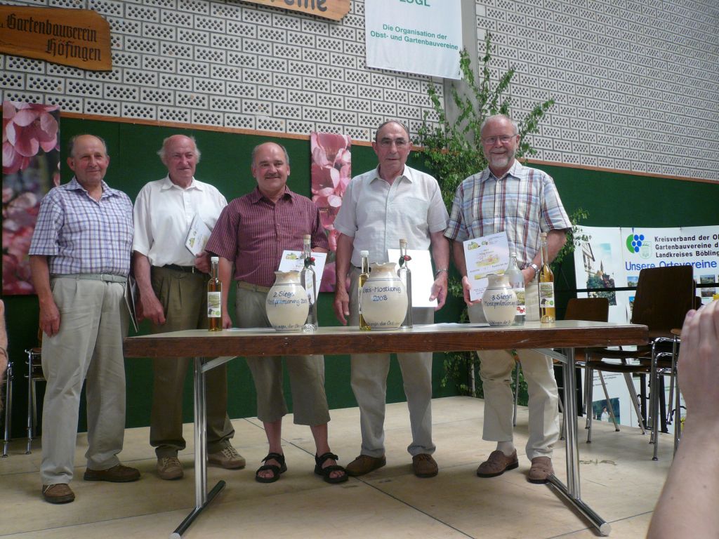 MOSTKÖNIG gesucht!Zum Auftakt des 75jährigen Jubiläums des Obst- und Gartenbauvereins Höfingen fand am Dienstag, den 17. Juni 2008 im ev. Gemeindehaus Höfingen eine Mostverkostung statt. Alle Mosterzeuger des Landkreises Böblingen wurden zur Teilnahme aufgerufen. Ihre Moste mussten bis 19.00 Uhr zur Bewertung abgegeben werden. Insgesamt waren es 37 Moste, die es zu bewerten galt.
