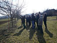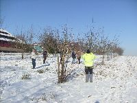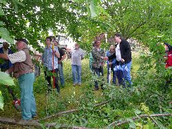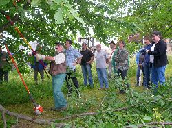 Nachdem wir dort angekommen uns in zwei Gruppen aufgeteilt hatten, begann die praktische Unterweiseung in der hohen Kunst des Obstbaumschnitts.
