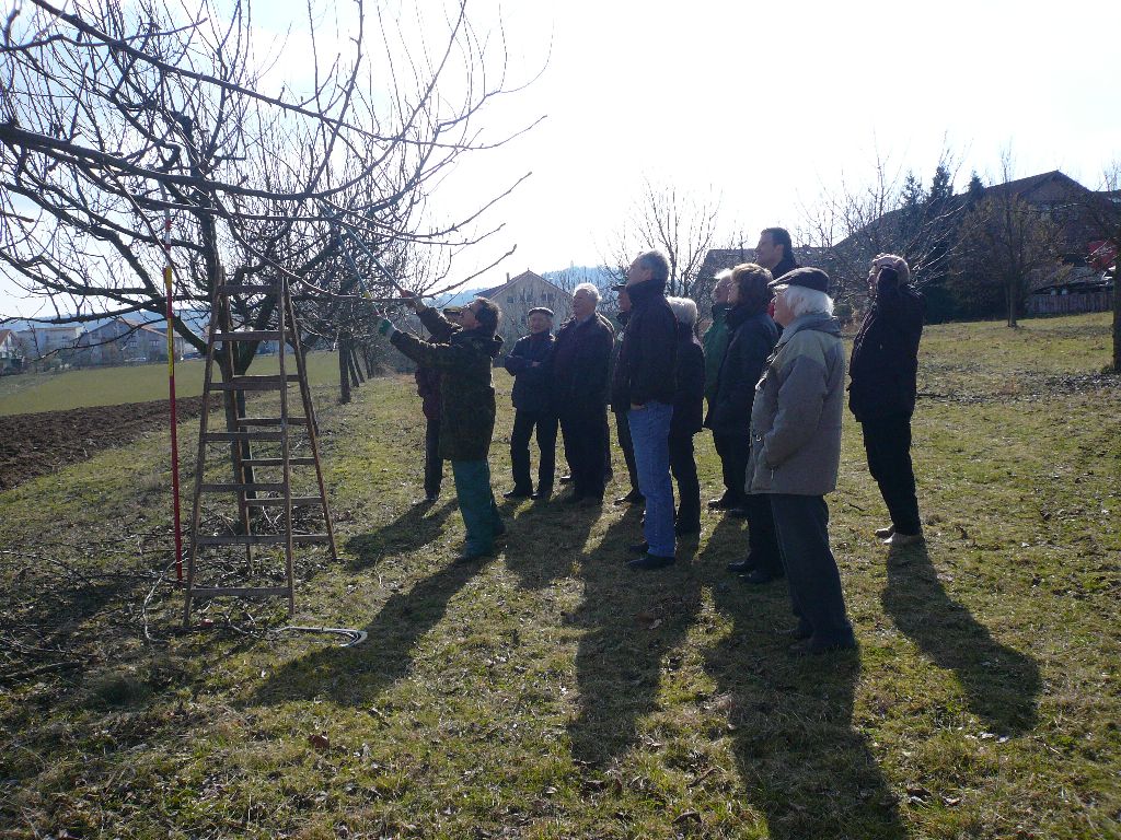 In diesem Jahr musste mal wieder unsere Obstbauwiese im Gewann Pfad geschnitten werden. Unser Fachwart Hannes erklärte uns hier den so genannten Oeschbergschnitt der vom Pommologen Helmut Palmer propagiert wurde.