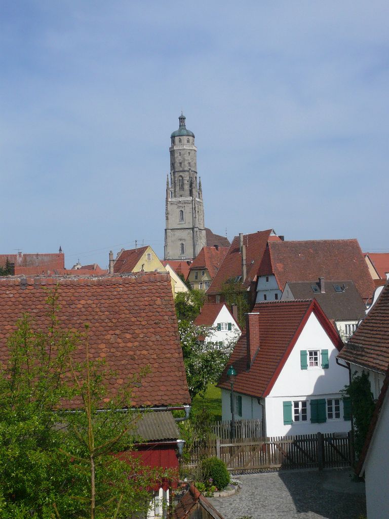 Ausblick auf die Dächer der Altstadt und den langen Daniel, den Kirchturm von Nördlingen.