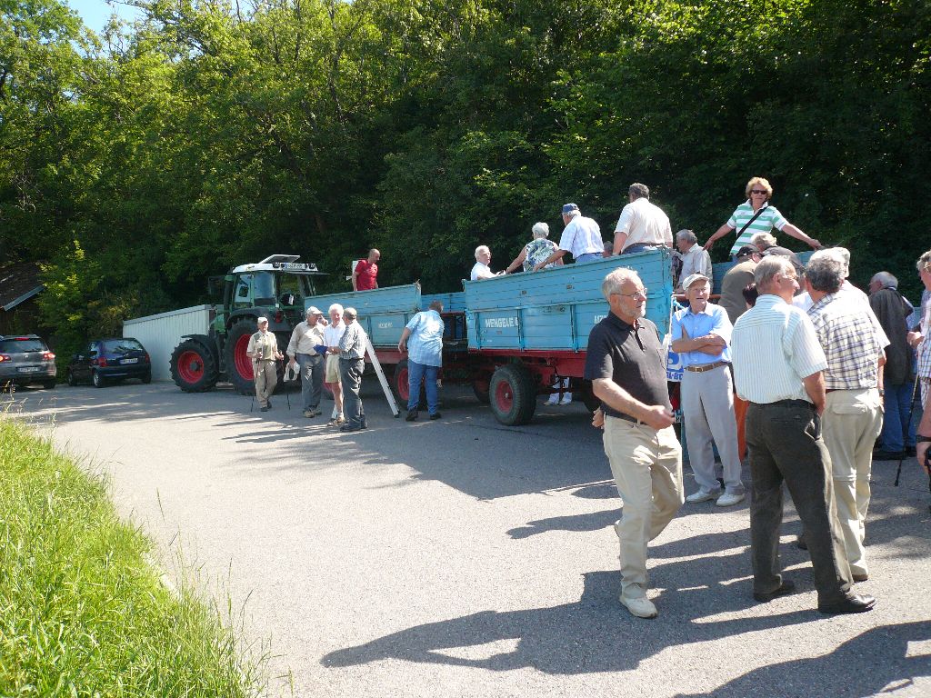 Danach wurde es für alle etwas weniger anstrengend. Der OGV Mönchberg hatte ein Traktorgespann mit zwei Hängern vorbereitet, auf denen Bänke montiert