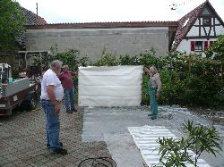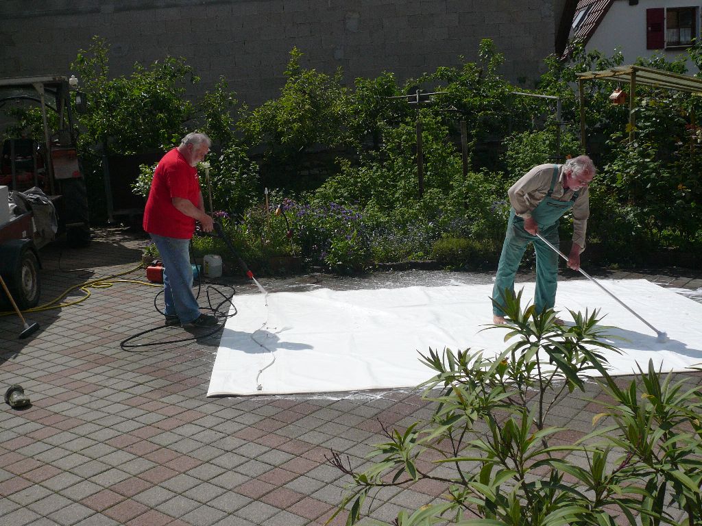 Der OGV Höfingen macht nicht nur Versammlungen und Ausflüge sondern auch wichtige Arbeiten, die sonst niemand sieht. Nach einer Veranstaltung warn die Planen unseres Verkaufsstandes doch recht schmutzig zurückgekommen. Deshalb war eine Grundreinigung notwendig.